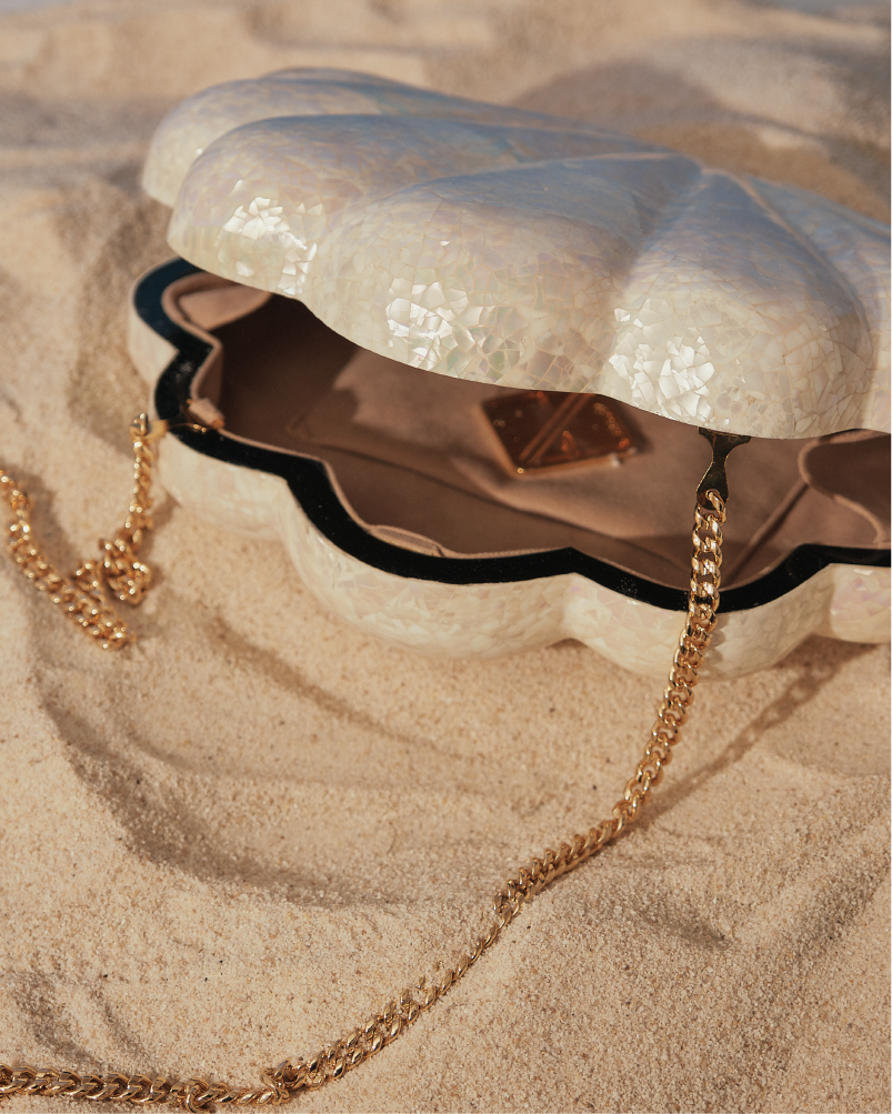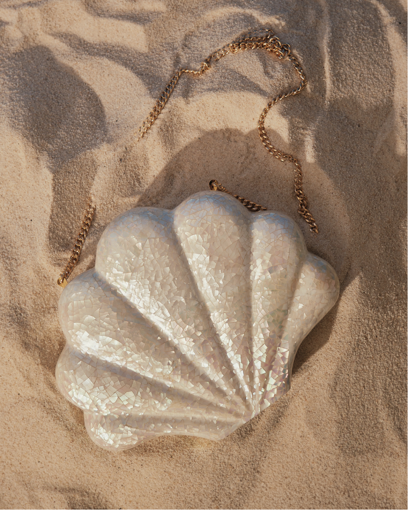 The Almeja is a masterpiece of elegance, crafted with a Mother of Pearl shell and a gold chain strap option. Its luxurious design adds a touch of sophistication to any outfit, making it the perfect accessory for any occasion. Elevate your style with the Almeja clutch.