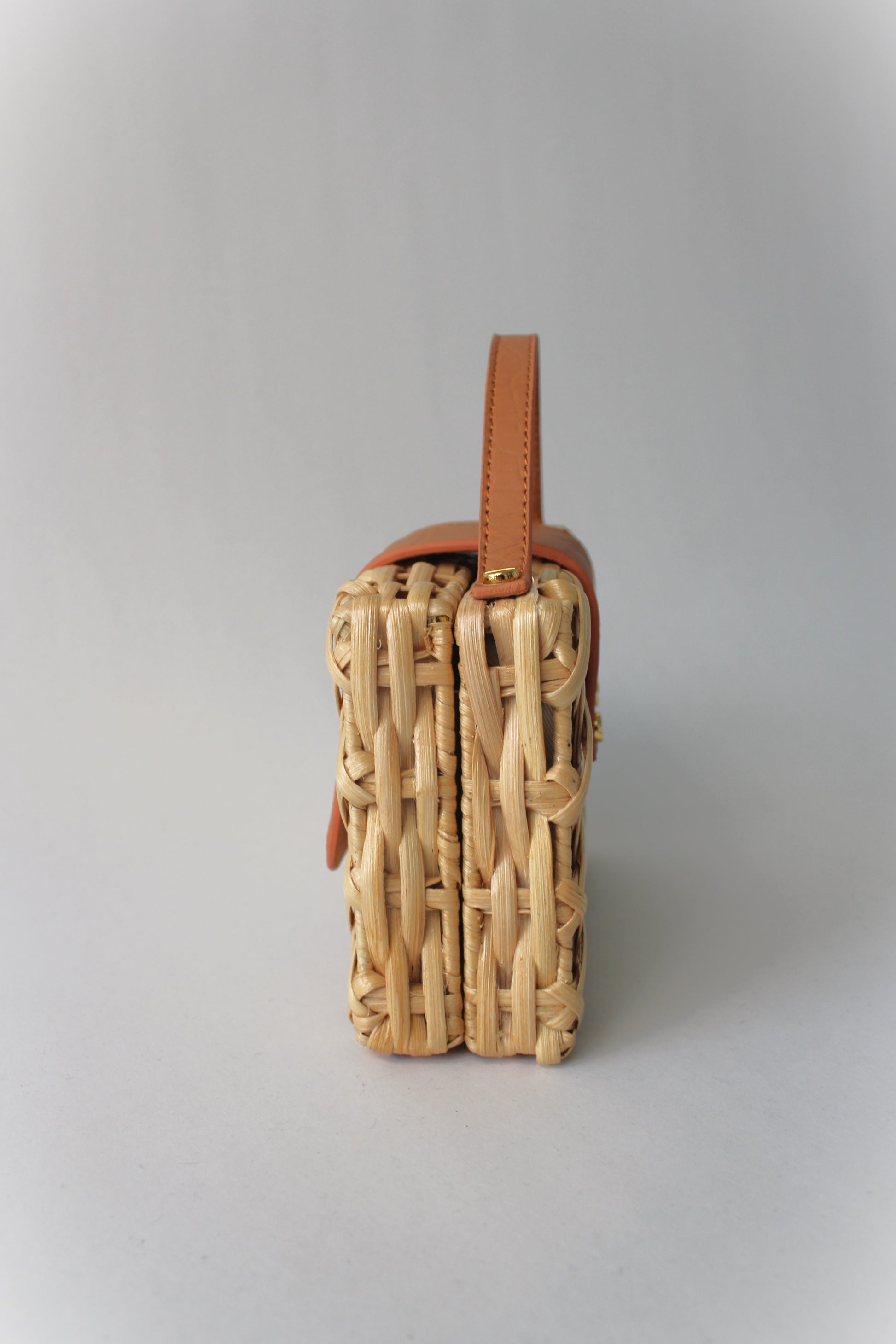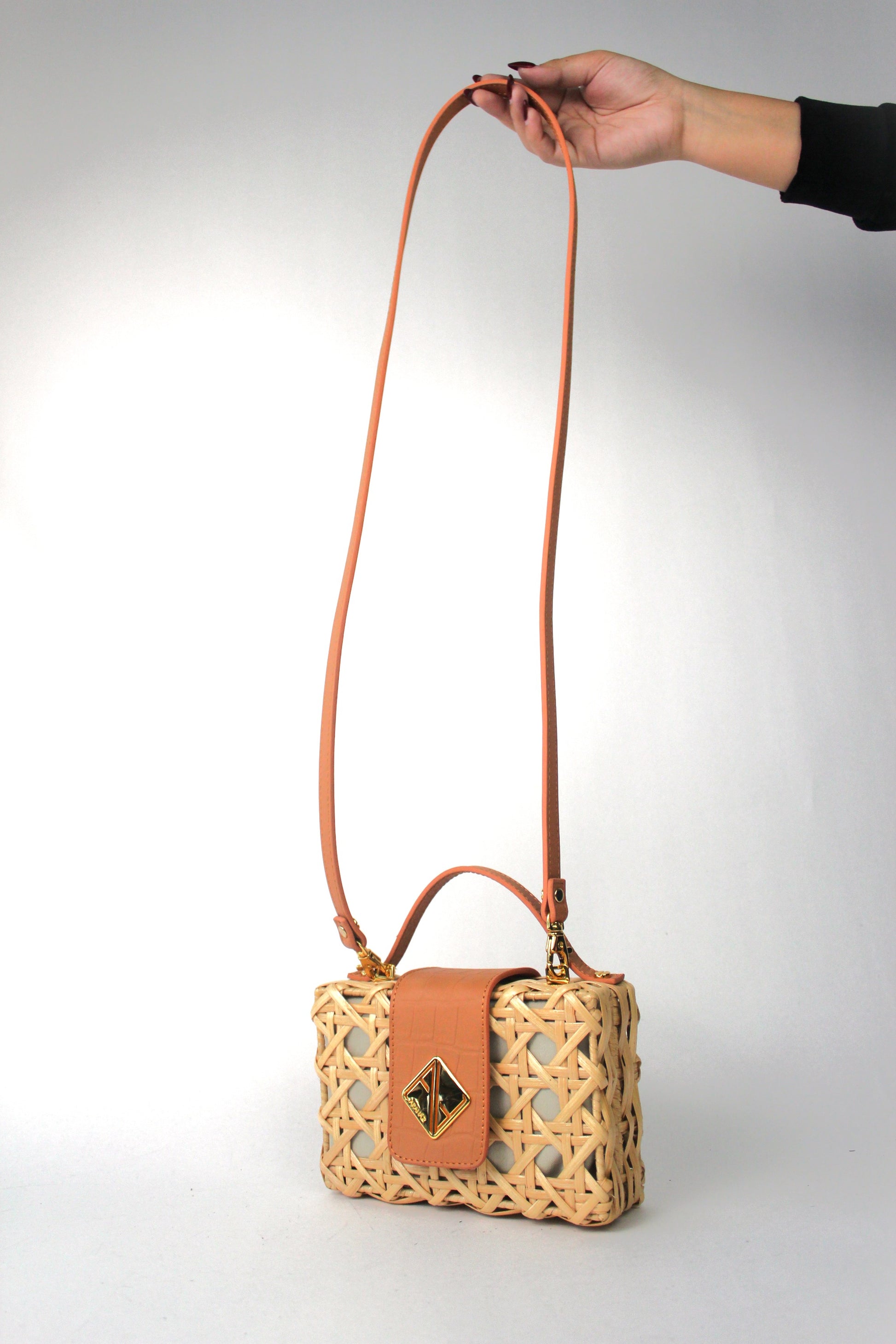 Made with handwoven solihiya rattan and trimmed with genuine leather. Comes with a removable leather strap.