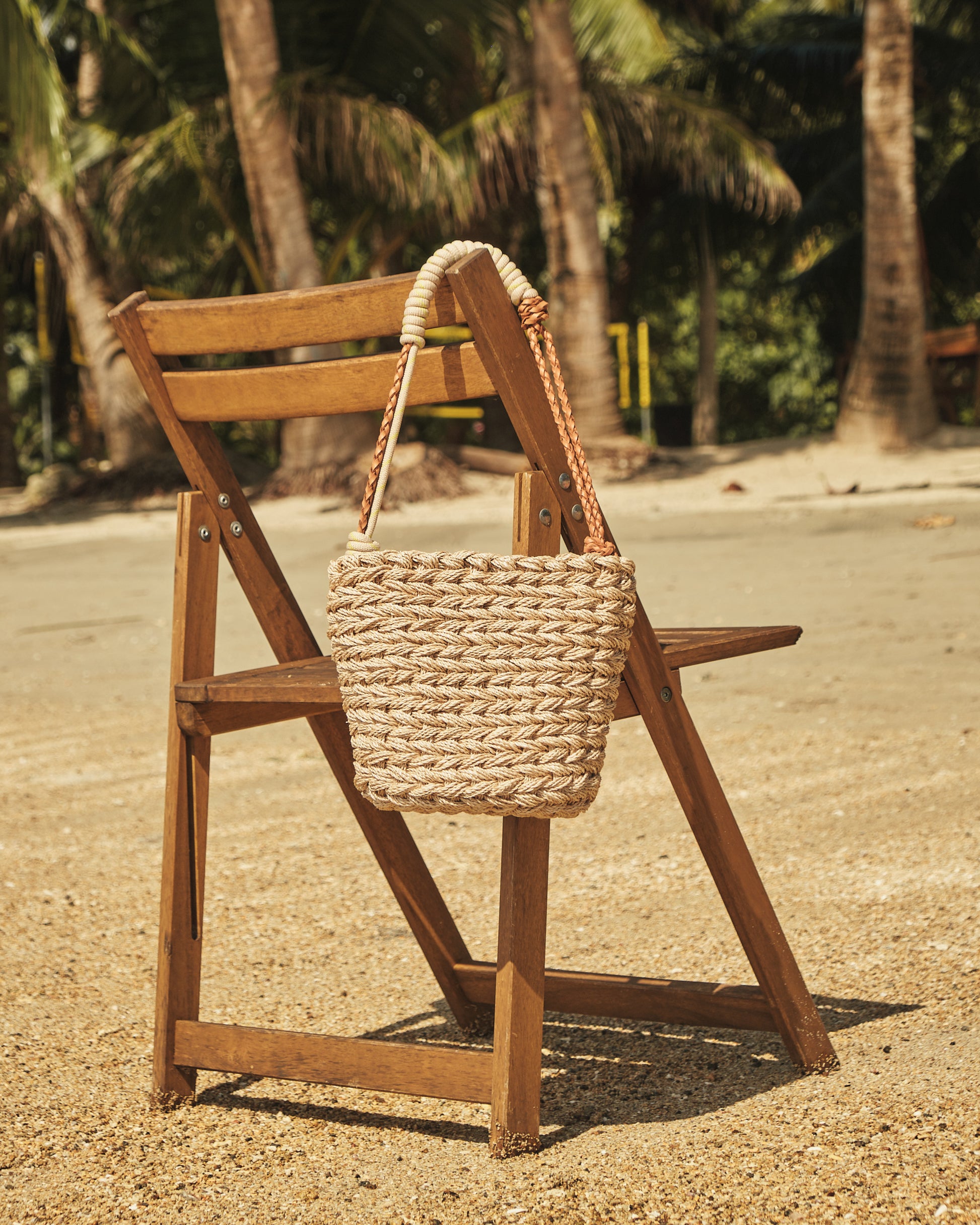 Introducing the Clove Hitch, a must-have for any fashionista. This braided abaca-patterned handbag exudes elegance and sophistication. Its braided tan leather handles add a touch of luxury to any outfit. Elevate your style with this exclusive accessory.