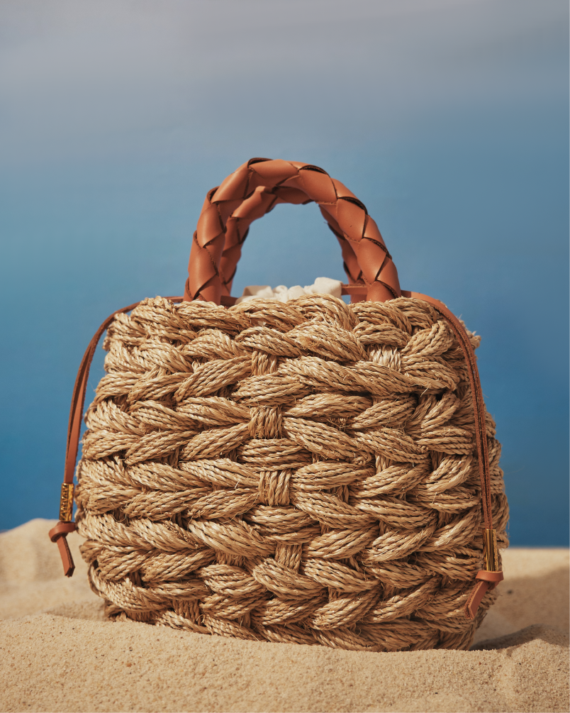Introducing the Clove Hitch, a must-have for any fashionista. This braided abaca-patterned handbag exudes elegance and sophistication. Its braided tan leather handles add a touch of luxury to any outfit. Elevate your style with this exclusive accessory.