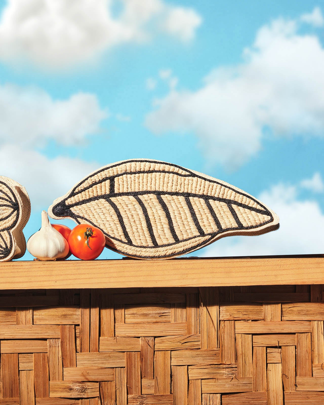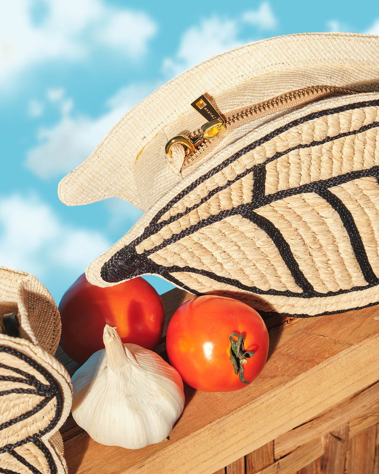 A hand embroidered leaf shaped straw clutch bag with a removable leather sling and zipper closure— because sometimes your accessories deserve to be as fun and flirty as you are. Slip it on for day, detach the strap for night time clutching.