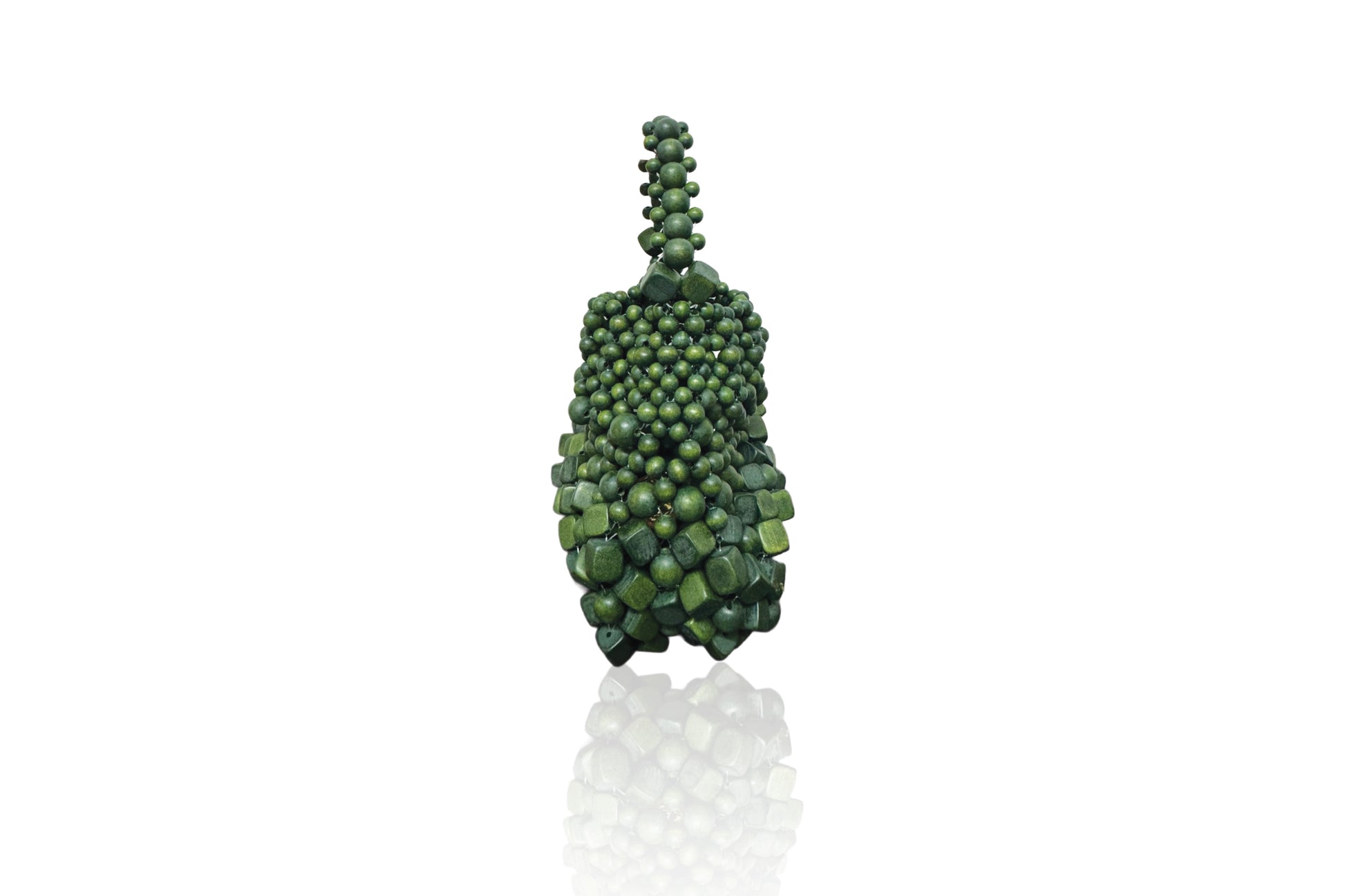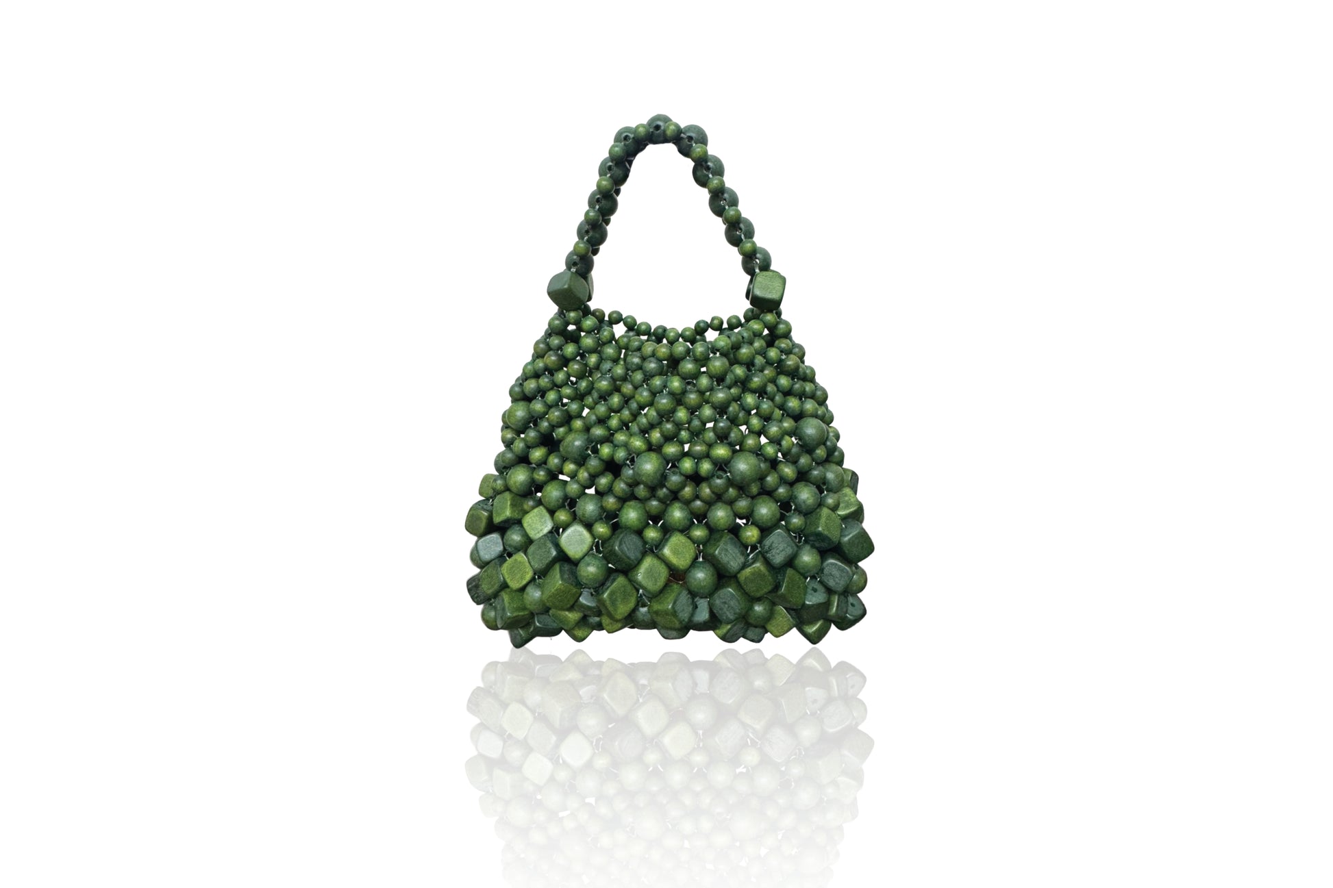 An exquisite handbag featuring hand-assembled wooden beads carved into precise cubic forms. A statement piece for those who seek understated elegance with an intriguing edge.