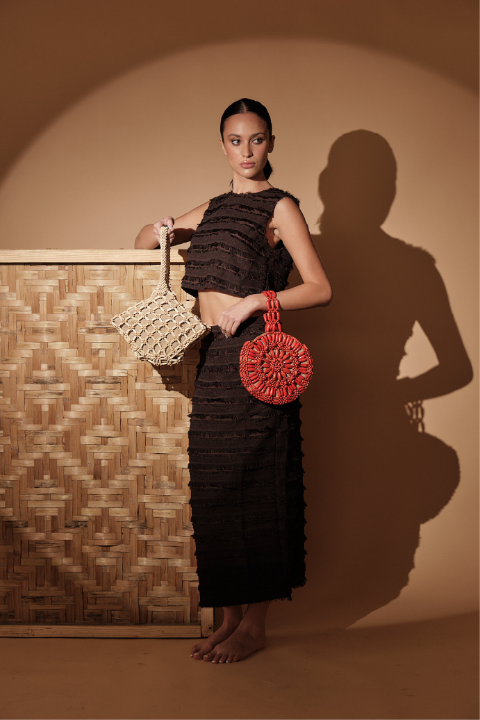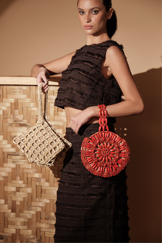 The Flordeliza handbag features a graceful round shape. Made entirely of wood beads with a soft suede fabric lining, it combines natural textures with elegant craftsmanship for a refined accessory that complements any sophisticated ensemble.