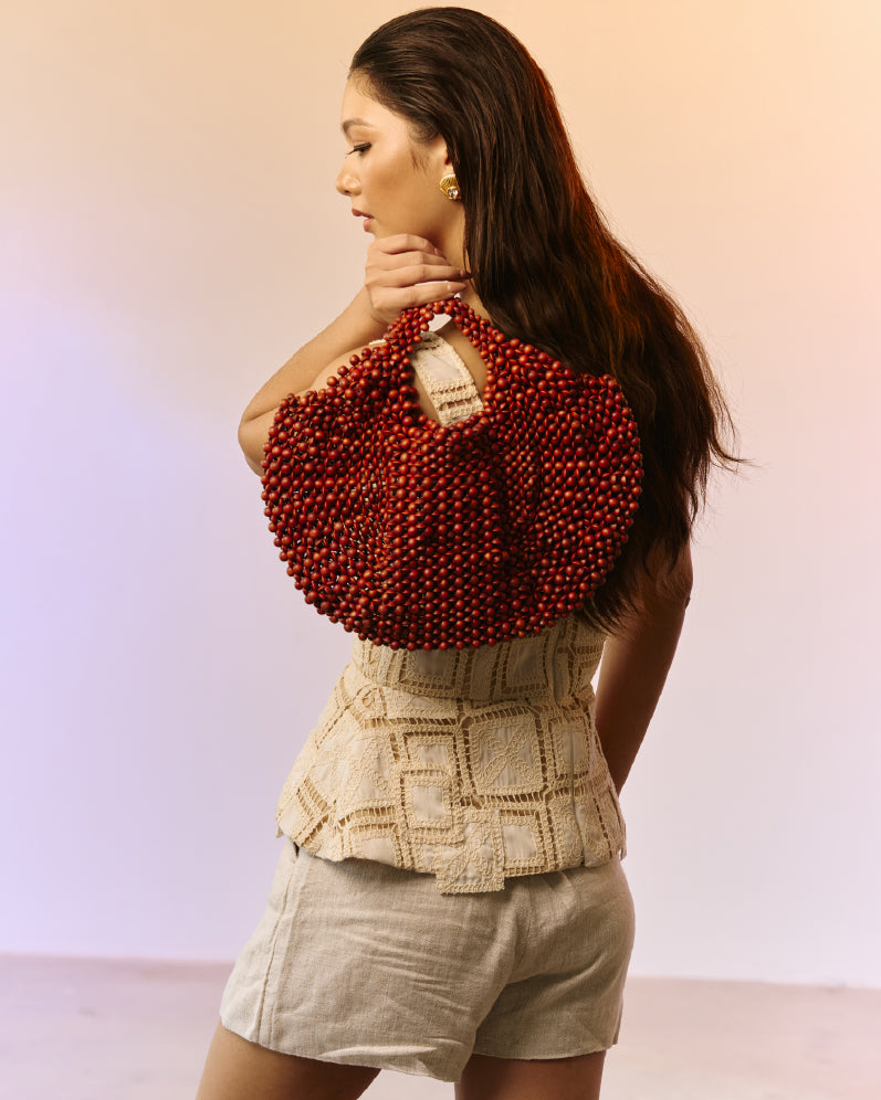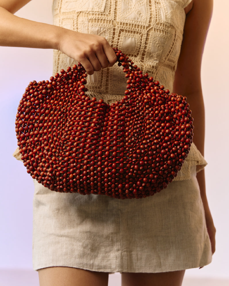 The Lagrima Large is an upsized version of one of our bestsellers. A finely handwoven wood bead bag provides that pop of color to your look.