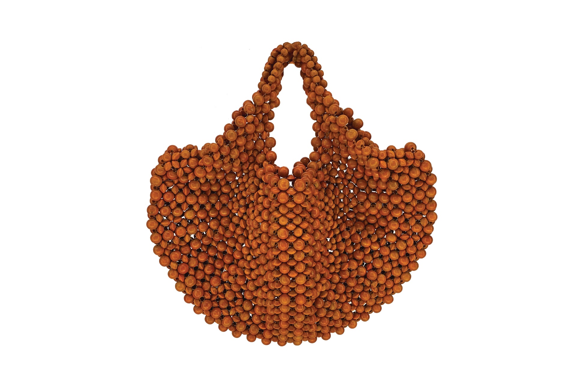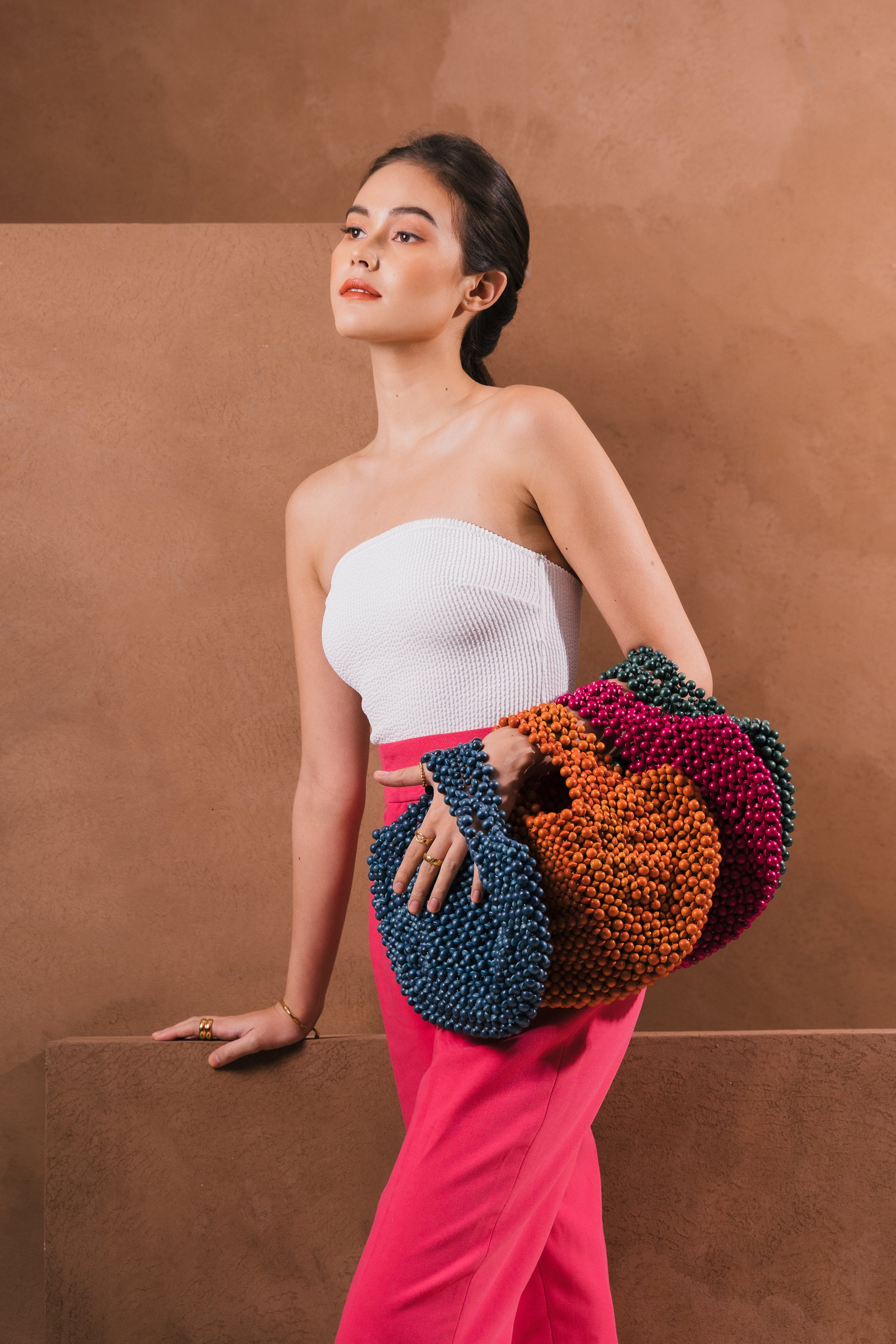 The Lagrima Medium is a finely handwoven wood bead bag provides that pop of color to your look.