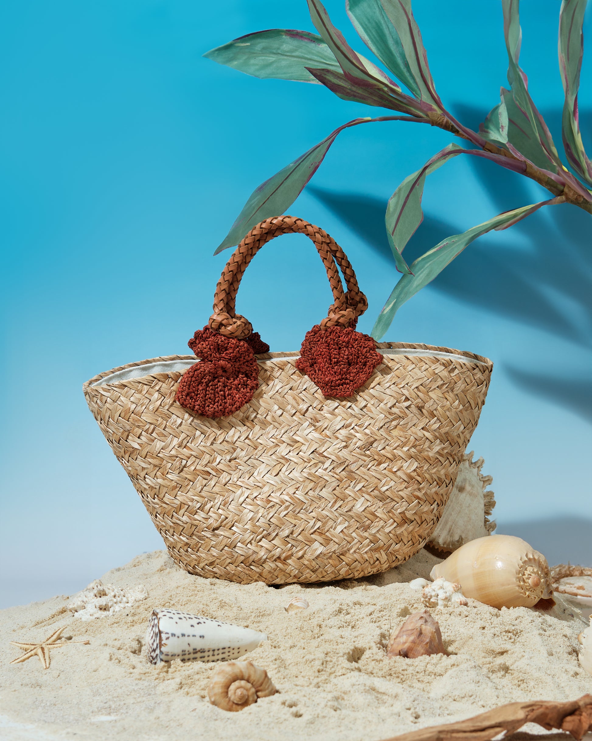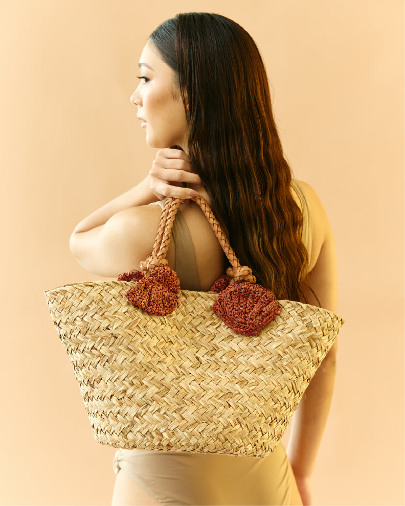 Indulge in luxury with our Oskola basket in a rich rust hue. The Lupiz tote bag features intricate crocheted raffia shell details and supple braided leather handles. Elevate your style with this handcrafted, one-of-a-kind piece.