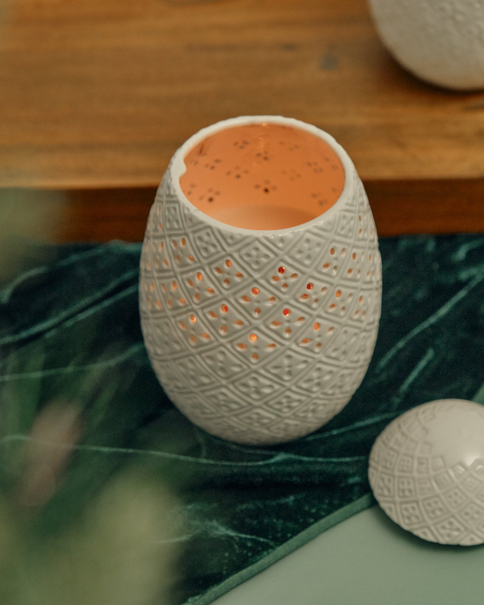 It is a beautiful sculptural piece that serves as a table top accent when not in use. When lit, the cut out pattern transforms the vessel into a pretty lantern.