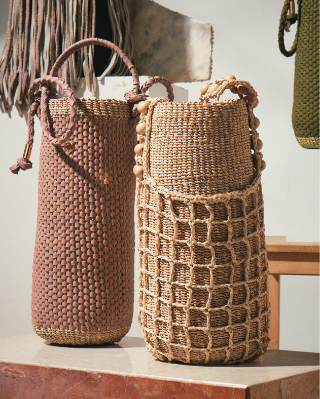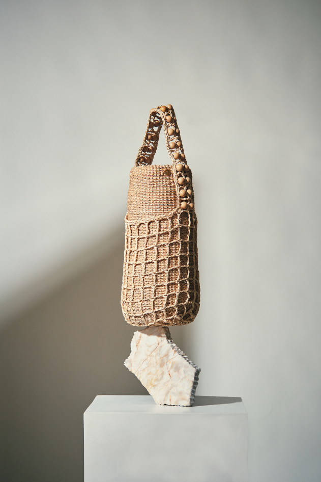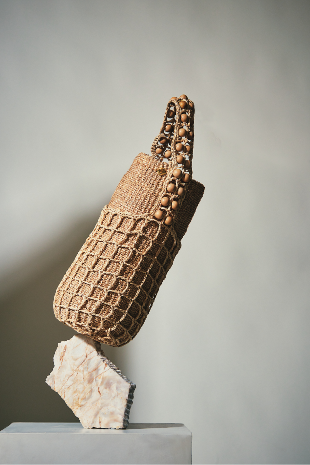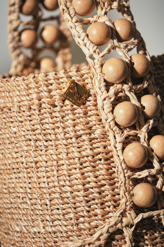The chicest straw bag: the Rosanna Lambat. A one-of-a-kind, cylindrical handbag adorned with a woven mesh crafted from raffia. The unique mix of raffia and wood bead handles adds an extra handmade touch. Elevate your style with this exclusive accessory.