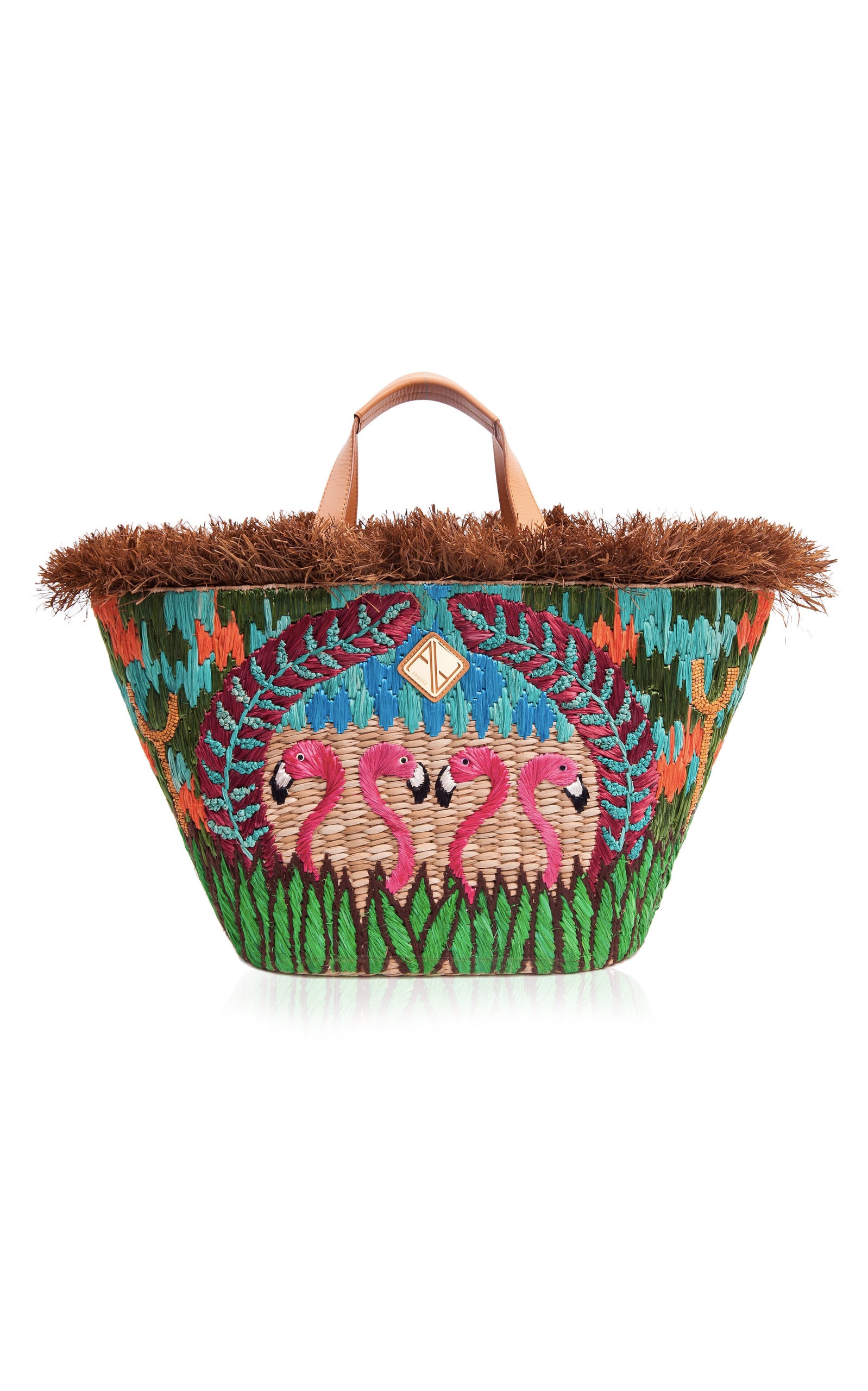 Part of the ARANAZ Signature Collection, The FLAMINGO TOTE is one of our international bestsellers worn by beach lovers around the world. First launched in 2013, it showcases a stunning embroidered tropical flamingo scenery that has become synonymous to the brand. Raffia fringe trim. Comes with leather handles and magnetic snaps.